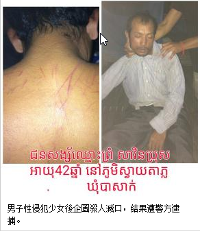 (柬埔寨‧柴楨訊)中年漢性侵犯少女後企圖殺人滅口,結果遭警方逮捕。 這起事件是於前天晚上7時30分,在柴楨省檖尊縣發生。被捕的嫌犯為波沙文(42歲),受害者15歲,2人住檖尊縣。 據警方指出,事發前,波沙文在外面喝酒,喝醉後走路回家,經過受害者的屋前時,發現她在屋裡獨自睡眠,就闖入侵犯了她。 事後,波沙文把少女打昏,拖到屋後的水池,把她按入水中企圖殺人滅口,受害者的母親剛好回到家,見狀高喊,驚動附近民眾及警方前來圍捕波沙文,把他押往警局立案,依法處置。 身心受傷的少女由家屬送往柴楨省縣立醫院就治。(柬埔寨星洲日報) |