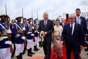 (柬埔寨‧金边讯)缅甸总统廷觉于昨天抵达金边,对我国展开为期4天的国事访问。 应西哈莫尼国王邀请,廷觉从本月3日至6日访问我国,以加强柬缅两国传统友谊和合作关系。 昨天下午,西哈莫尼国王在王宫举行隆重仪式,欢迎廷觉的到访;过后,廷觉前往独立碑和国父西哈努克纪念碑献花。 今天上午,廷觉将前往和平大厦,与洪森总理举行双边会谈;之后,将参观金边地标塔仔山,下午则前往暹粒,以游览被列为世界文化遗产的吴哥窟。 属于缅甸全国民主联盟领袖昂山素季心腹的廷觉,是于去年3月获提名出任缅甸总统,接替前军人政府领袖登盛。() ![]() 缅甸总统廷觉和夫人在王廷事务部长关森沃陪同下,在机场检阅仪仗队。(图:柬埔寨星洲日报) |