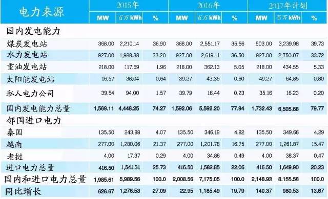 柬埔寨电力建设取得了显著业绩,15年来供电能力增11倍。 柬埔寨电力机构发布的2016年总结报告称,柬埔寨总装机容量从2002年的180兆瓦,增至2016年的2008兆瓦,增长11倍。另外,销售电量也同样增长了11倍之多,从2002年的6.14亿度,增长至2016年的71.75亿度。 数据显示,截至去年年底,柬埔寨电力公司在全国供电能力达到2008兆瓦,比2015年增长了19.79%,其中国内产电能力为1592兆瓦,包括煤炭发电(368兆瓦)、水力发电(927兆瓦)、重油发电(218兆瓦)和再生能源发电(39.27兆瓦)和私人电力公司(39.79兆瓦)。此外,邻国提供相应发电出力为416兆瓦,占总供电能力约两成,其中泰国提供电力135兆瓦、越南277兆瓦和老挝4兆瓦。 去年,柬埔寨从邻国购买电力为15.82亿度,其中从泰国购买3.46亿度、越南12亿度和老挝3488万度电。 报告称,国内电力供应能力将从1592兆瓦增至今年的1732兆瓦,至于邻国供电保持不变,因此今年柬埔寨电力公司供电能力将达到2148兆瓦。 目前,全国高压输变电线路(115kV和230kV)总长达1525公里,共建有25个变电站,分布在14个省市,及间接覆盖另外4个省份,建设总投资金额多达8.34亿美元。 截至去年年底,超过一万村庄拥有电力供应,占村庄总数的74.74%;用户总数达191万户,占用户总数的58.23%。 另外,全国共有342家公司获颁电力服务营业执照,在指定区域内经营电力服务,随着国内电力供应的普及,由私人公司在农村供应的电价不断下调,目前全面农村地区最高电价从每度3700柬币降至每度3000柬币。 ※来源柬埔寨中国商会 |
