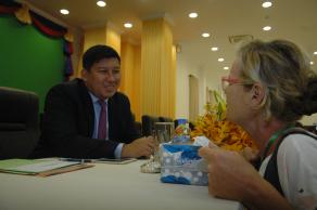 环境部长塞宋沃在研讨会上与一名国际机构代表交流。 |
