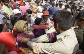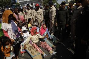 昨天上午,来自国公省约200名村民,游行前往洪森总理豪宅(独立碑附近)示威及提呈请愿书,要求洪森总理出面干预,岂料到了兰卡寺庙附近时,遭警队和金边市政府保安员阻挡,不允许村民继续游行。 当时,双方爆发短暂暴力冲突,结果造成3名妇女受伤。 村民指出,他们多年前便与一家经济特许地开发商发生土地纠纷,至今仍未获得解决。(柬埔寨星洲日报) ![]() 示威的村民情绪激动。(图:柬埔寨星洲日报) ![]() 金边市政府保安员阻挡村民前进。(图:柬埔寨星洲日报) |