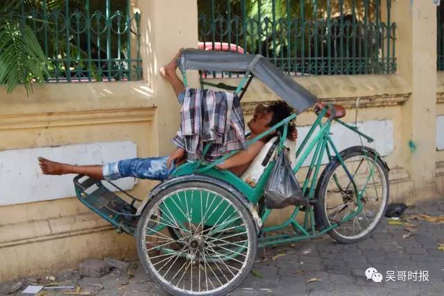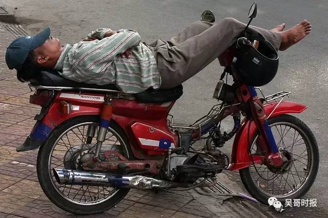那请问你知道“柬埔寨睡”吗?柬埔寨是佛教国家,同时长期受法国殖民统治影响,造就了柬埔寨人逆来顺受的性格和惬意安享的生活习惯。下面来看看柬埔寨人的“睡姿”吧。 先把摩托车挺好,双腿放到车头上,交叉双手,这样能保持平衡,再加上戴着头盔,睡眠质量还是挺好的。