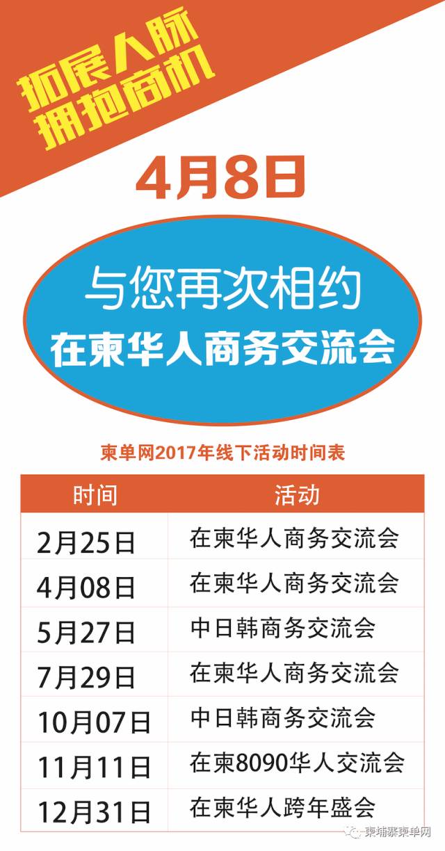 【活动预告】 ▼ 4月8日 晚 17:30 (第三届) 【在柬华人商务交流会】 (点击了解详情) 5月27日 晚 17:30 (第五届) 【中日韩国际商务交流会】 (点击了解详情) 【赞助咨询】 Carrie:010-693-008 【感谢如下已签约赞助单位】! |