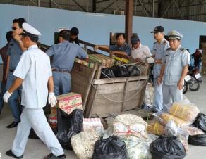 (卜迭棉芷讯)卜迭棉芷省货检局官员查获1顿藏在拉车内的劣质鸡肉与肉丸。 执法人员是于昨天上午,在卜迭棉芷省波比市国际关口起获这些变质食品,并在行动结束后把食品烧毁。 卜迭棉芷省货检局局长贤西南说,当局之前接获消息,指有奸商偷偷将劣质食品藏在拉车里,从泰国非法运入我国。 他获得消息后,下令省货检局副局长洪亮与各相关单位合作,在关口严格搜查,结果上午11时,执法人员在一个拉车查起获300公斤的劣质鸡肉。 当天下午,执法人员再查获300公斤劣质鸡肉、700公斤劣质肉丸及一批逃税饮料,包括120箱冬瓜茶、20打汽水等。()