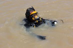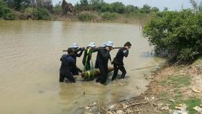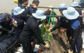 柬埔寨排雷行动中心(CMAC)潜水组于从洞里萨湖底劳起两颗MK2炸弹。 ![]() 排雷人员小心翼翼移走当年由美军空投的炸弹。 ![]() 水下排雷人员在磅清扬洞里萨河搜寻炸弹。 |