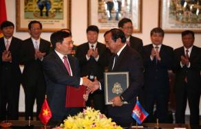 柬埔寨外交部长巴速坤与越南政府副总理兼外交部长范平明(左)交换文件。(图:柬埔寨星洲日报) |