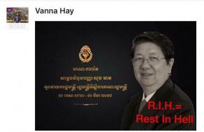 (柬埔寨‧金边讯)政府发言人兼内阁事务部国务秘书帕西潘警告,他将入禀法院,提控一名涉及在脸书侮辱宋安亲王的男子。 帕西潘昨日向媒体指出,身为内阁事务官员,在结束宋安亲王的葬礼仪式后,他将入禀金边初级法院,起诉网民Vanna Hay,他涉及侮辱已逝世的宋安亲王。 Vanna Hay在脸书上传一张宋安亲王的照片,并在该照片写上RIH(Rest In Hell,意即在地狱安息)。 消息称,Vanna Hay目前在日本打工,是救国党活跃份子。(柬埔寨星洲日报)