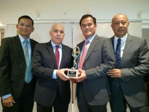 邮政局总监奥柏拉(右二)代表领取由全球贸易领袖俱乐部颁发的“2017年国际质量奖”。(图:柬埔寨星洲日报) |