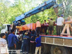巨型“长臂琴”将成为今年吴哥宋干节的焦点。 ![]() 工作人员出动吊车,小心翼翼把巨型“长臂琴”运往盛会现场。 |