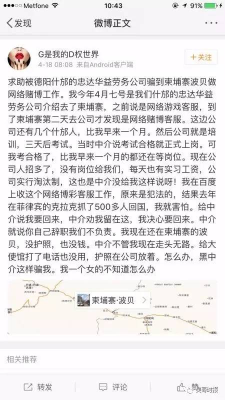 | 今(18)日上午,一名四川女孩在微博上求助,称自己被骗来柬埔寨,现在想回家,护照却被公司收了,不知该怎么办好。 一四川女孩在微博上求助 本报记者联系了这名在微博上发帖的女孩。女孩称,她姓刘(化名),本来以为是过来做网络游戏的客服,来了后才发现是做网络赌博的。 “我听说中国人做网络赌博是违法的,去年都被抓过很多回国,我很害怕。我想回家。还有中介收了我1万2的中介费,也不知能不能退。”刘小姐说。 据悉,中国公民不论在国外还是国内,从事网络赌博、客服等,都属于中国管辖范围,涉嫌刑事犯罪的都将被查处。 【最新消息】 截止记者发稿时,刘小姐已让家里人帮忙买了后天回国的机票。但现在最担心的是,到时候公司会不会扣着护照不给,身无分文没有护照哪里都去不了。 来自:吴哥时报 |