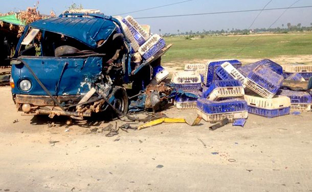 (柬埔寨‧金邊訊)運載雞肉卡車飛速駕駛,失控猛撞運水泥車,造成4人分別受輕重傷。 這起事件是於昨天清晨5時30分,在菩森芷區下森隆分區發生。 消息稱,事發前,4名男子共乘一輛運載肉雞卡車飛速行駛,駛至案發地點時,因車速太快來不及煞車,突然失控猛撞反方向車道的運載水泥卡車,導致車內的4人分別受輕重傷。 事後,警方趕到現場把傷者送往醫院療傷,並把卡車拖往警局,等候處理。() |