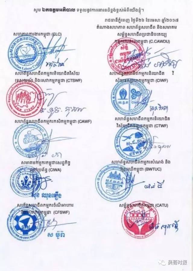 尽管金边市政府已经明令禁止工会在五一节游行,但工会头仍然表示将如期举行活动。 前(27)日,金边市政府警告各工会和协会领导,如果五一在公共场地集会游行,政府将采取法律手段制止。 上星期五,服务业、农业和工厂等工会和协会代表向政府提交申请,将于五一劳动节当日早上7:00—12:00,在金边奥林匹克运动场外集会,并游行至劳工部提交请愿书。 各工会将联合举行游行(从上往下是:柬埔寨工人联合会、柬埔寨旅游服务工人联合会、柬埔寨农业工人联合会、非经济体系工人协会、餐饮服务业工人联合会、工业工人联合会、运输工人联合会、建筑、木材工人联合会) 政府对该申请作出回复称,为了不影响公共安全和交通秩序,只允许这些工会和协会在奥林匹克运动场里面举行集会活动,不能在运动场外集会和公路上游行。并且政府警告这些工会和协会,如果不遵守规定集会游行,政府将采取法律行动和相关措施。 柬埔寨宪法第37条和51条规定,人民有自由进行和平的罢工、示威游行的权利。但在集会游行前需先向政府提出申请,政府需作出正面回应,并采取安保措施。 工会代表表示,政府不允许他们集会和游行,这干涉了他们的自由权利,他们将继续按照原计划进行集会、游行,提交请愿书。 此外,还有其他的制衣、建筑、旅游、农业、工业等工会和协会向政府提出申请,将于五一节当日在柬埔寨发展理事会前集会游行,并向国会递交请愿书。 但政府明确表示,各工会协会不能在公共工场地进行集会游行示威活动,只能在工会自己的场地或者其他经过私人同意的场地进行。不能影响公共安全秩序,否则政府将采取措施制止,一切后果自负。 即使如此,工会代表仍然表示,他们将会按照原计划进行集会游行。 柬埔寨劳工联合会主席艾吞日前表示,五一游行将有逾三千人参加,游行队伍将从塔仔山附近的柬埔寨发展理事会游行至国会大厦,以递交请愿书。 他说,此次游行活动,旨在呼吁政府保障工人的权利、进一步提高工人基本薪水和享有更多福利。 五一节工会集会游行安排 【7:00—7:30】 工人自愿者与其他机构集合 【7:30—9:30】 游行到国会 【9:30——9:50】 陈述发言庆祝劳动节 【9:50—10:50】 工会代表和其他协会陈情 【10:50—11:10】 向国会递交请愿书 【11:10—11:30】 宣布活动结束 来自:吴哥时报 |