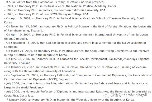 你看,他这样子,我怎么可能熬得过他呢?再者,我今天拥有自由、拥有舆论支持,都是因为国际社会的同情,或者更准确地说,是拥有西方世界的同情。但近几十年内,有没有任何一个案例中哪一位领袖因为得到同情而被国际社会送回家去获得了政权?人家都是回到人民中去熬过苦难,或者回去把牢底坐穿,坐到关你的人都不好意思了,就像昂山素季一样被放出来当上领袖。我这样子,风声紧的时候就躲在外面喊几嗓子,风声松点儿了又回去金边领导游行,固然是万无一失,但也多亏了柬埔寨同胞们脾气好,一点都不介意我这么滑头。如果我回去,明年一选举完,在联合政府里应该能当个副首相兼外交部长,虽然改变不了金边政府的现状,但至少从此有了影响内政外交的一点点机会。这个世界上,最要不得的人,是面对陈旧的事物,置身事外一边猛烈批评、一边也不同流合污的人;而真正有用的人,是投身其中,以对手陈旧的方式成长起来,再从内部击破之,从而领导改革的人。所以,我要当有用的人。 这样做,对洪首相也是有用的。最近两年,被我这么一折腾,洪首相在国际社会已经是唱实了白脸,出了东盟十国寸步难行,现在就剩中国与朝鲜最愿意跟他做好朋友了。如果我突然回到柬埔寨,愿意同舟共济,那么洪首相从此在国际社会不用演反派,柬埔寨的形象将变得可爱,美国与法国的援助又会回来。这些都还是次要的,我们做一件事情之前,一定要透过现象看本质,抓住事物的关键要点,分析透眼前的对象最想要的是什么。我们知道,洪首相一生最热爱的,是去别人的国家收集荣誉博士学位,我们来看一看他是如何将这一集邮式的爱好发挥到了饥不择食的地步,请看名单: 以上是别人帮洪首相统计的截至2009年他获得的荣誉博士学位清单,其中最靠谱的是第一个,翻译出来是:“柬埔寨高等教育政治学学士(不知道哪一年毕业的)”,这是它的原文,也不知道是柬埔寨哪个大学。再往下,是狂风暴雨都阻挡不了的节奏,其中最不靠谱的是倒数第二个:“哥斯达黎加生意大学,外交与国际关系学荣誉教授,授予时间2008年7月”,所以呢,洪首相也是当过教授的人,而且还在南美洲。这个清单每年都在高速增长,到目前为止,经过我的目测,所有这些大学里最高端、大气、有含金量的要数: 其实,洪教授在追求985、211工程研究型大学尖端学术成就的道路上原本可以走得更高更远,但由于我的唱反调,现在他的活动半径受到严重限制。经过多年深耕于中国,洪教授已经拿尽了所有可能的中国大学名誉博士学位,终于,广西民族大学已经是他学术造诣的最高极限,接下来已再无可在中国发挥之余地。一旦我不再站在对立面,国际社会就将消除对洪教授的偏见,那么下一步他将有可能再接再厉,冲出亚洲、走向世界,争取早日集完七龙珠,啊,不好意思说错了,早日取得更高更广泛的学术成就。 这样做,对柬埔寨也是有用的。一旦停息同室操戈,金边将不再受有规律、间歇性的罢工游行运动之骚扰,本土同胞将更能其乐融融、安居乐业,外国投资者将更有信心来到Naga world进行赌博活动。一切都会变得更美好。 我面临的风险是什么?就是乡下的同胞们会以为我反水了,从此再不跟随我。这是极有可能的,然而日久见人心,我的一片赤诚与良苦用心,终有一天会被人发现,王尔德说过“If one tells the truth, one is sure, sooner or later, to be found out.(如果你说了实话,你总有一天会被人揭穿)”。退一万步讲,就算我永远失去了乡下的同胞,也并无所谓,因为他们对我最大的帮助就是为我投票,然而,你真的觉得我以为柬埔寨的选举是靠数谁得了多少选票谁就可以执政当国的吗? |