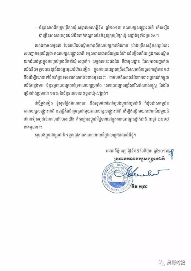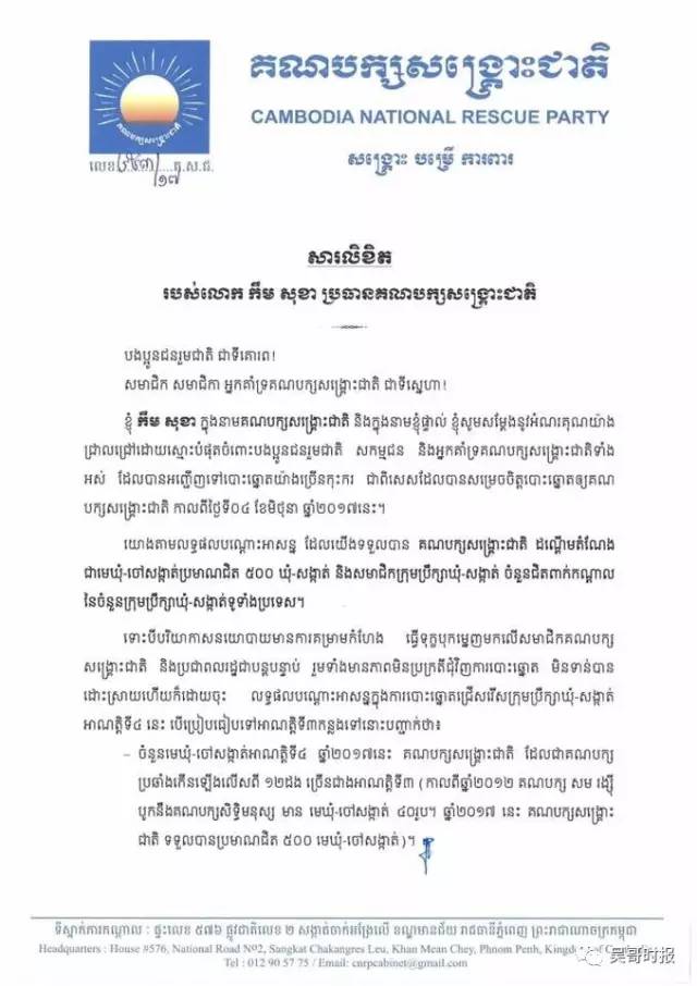 今(5)日下午,救国党主席金速卡发表声明称,救国党已经大获成功。 在声明中,金速卡代表救国党感谢所有给救国党投票的选民。此次乡选举,救国党获得了近500个席位,在乡、分区理事会中,救国党的成员占据了全国人数的近一半。 2012年乡选,沈良西党与人权党加起来选票也才获得42席,而今年这次却获得了近500席,且救国党成员占据了乡理事会的近半人数。从这看救国党已经大获成功,为2018年大选胜利奠定了基础。 “以我的选举经验,明年在大选时支持救国党的人会比乡选多15%。”金速卡说。 金速卡呼吁救国党成员间相互多走动了解,多宣传救国党,力争明年全国大选取得更大的成功。 来自:吴哥时报