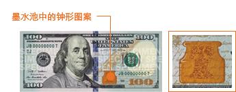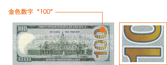 新版100美元钞票正面右下角的面额数字“100”,同样也采用了光变油墨进行印刷。手持钞票,将钞票倾斜,会看到钞票正面右下角的数字“100”从紫铜色变为绿色,随着钞票和视线的角度不同,其颜色也发生着不断的变化。