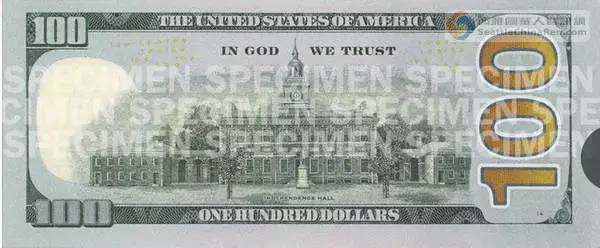 新版100美元钞票的背面右侧,印有醒目的大字体金色数字“100”。尽管此数字并没有采用太多的先进印刷技术,但采用大字体印刷有助视力障碍人士辨别面值。 来自:柬单网 |