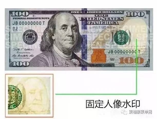 新版100美元中依旧使用了固定人像水印,当钞票对着光源迎光透视时,我们会在肖像右侧的空白处寻找本杰明·富兰克林的人像水印,从钞票两面均可看到该图像。固定人像水印应该说是最基本的辨伪措施,也是比较容易掌握的一项防伪措施。