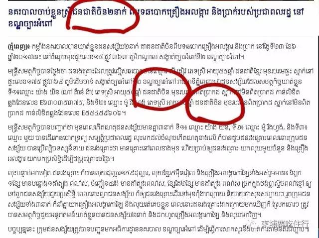 金边消息:2017年6月23日,柬埔寨媒体Fresh news报道一篇关于偷盗案件的新闻。报道中称:两名中国妇女在柬埔寨偷盗金银首饰被当地警方逮捕。 报道中描述:2017年6月23日柬埔寨警方在金边市363号大道15号抓获两名偷盗首饰的妇女。 受害人是当地一家首饰店55岁的老板。被偷盗的首饰价值159美金。其中包括,一条项链、戒指四枚、手链一条及5万瑞尔。 偷盗者目前已被当地警方逮捕并缴获全部被偷首饰。 新闻中报导两名偷盗者分别为:50岁妇女杨音及54岁妇女莫薇旺。新闻中称两名妇女均为中国人,并附上两人照片及护照。 而从两名盗贼的护照中可知,这两人的护照均为越文,国徽也并非我们中国国徽。因此可以断定这两名偷盗首饰的妇女并非中国同胞,而是越南人。 柬埔寨媒体在没有弄清嫌疑人身份前,就报道称是中国人作案不仅严重影响了中国人的良好形象,还伤害了我们中国人的自尊。 中国人被无辜扣上罪名!这个锅我们不背!!! |