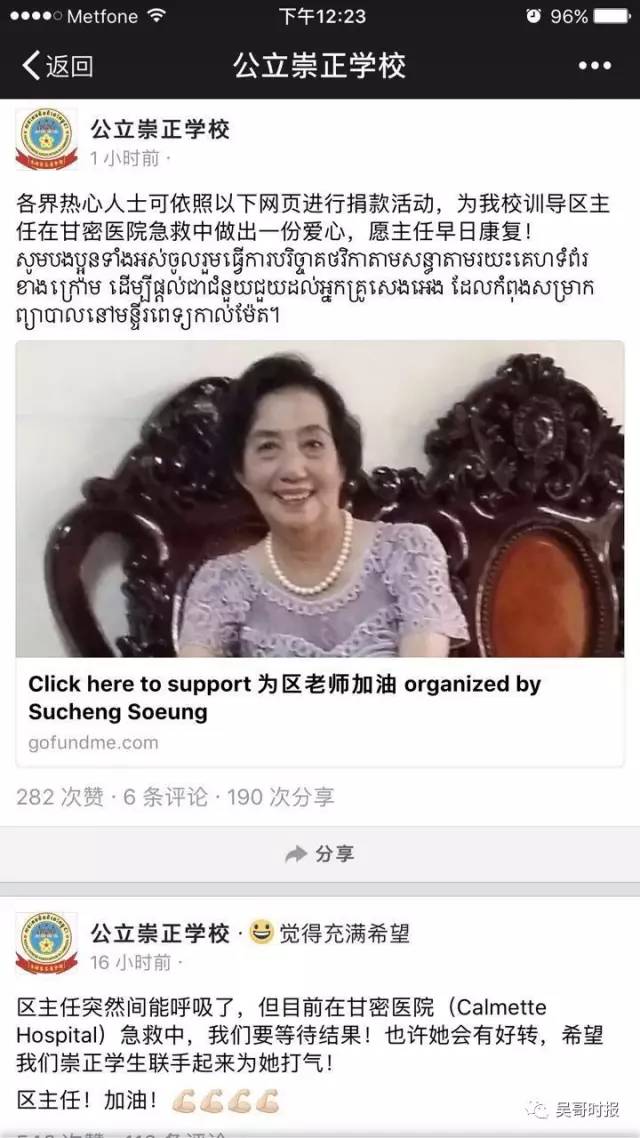 昨(25)日早上,金边崇正学校训导主任区美珍老师遭飞车抢劫,摔成重伤,一度被认为已身亡,家人准备办理丧事时发现还有呼吸,赶紧送往甘密医院抢救,目前情况稍有好转,但仍未苏醒过来。 昨日家人办理丧事时发现还有呼吸,又送至甘密医院抢救 今(26)日上午,《吴哥时报》记者前往区老师家,将本报及热心读者的慰问金交给家属。 昨天家人准备为区老师办理后事,今天灵堂已撤除。 昨日下午崇正学校官方脸书上号召同学们最后送别 区美珍老师今年68岁,先后在磅湛培华学校、金边崇正学校任教多年。昨天早上6:20,区老师坐摩的去医院检查身体,从医院回来时在230街与255街交汇处遭飞车党从后面抢劫,区老师被拽倒在地,头部受重伤。 案发位置示意图 载客的摩的司机称,飞车贼一伙共有3人,分骑2辆摩托车(最初传闻有8人,后证实为3人),从干隆街开始就一直尾随他们的车,到事发地时,加快速度从后面冲过来抢区老师的提包。区老师腿脚不方便,当时是侧着坐在摩托车上的,最初提包没抢到,飞车贼用脚踢摩托车,之后把区老师拽倒在地上,得手后随即逃逸。事发近一个小时后警察才赶到现场叫救护车过来。 昨天下午有消息称警方已抓获3名劫匪中的一个,后经审讯,该人并没有参与此案。目前三名劫匪仍在逃。 近日金边劫案频发,让市民们对金边的安全问题深感担忧。有市民怒骂政府无能,治理无方。 案发现场,目击者向警方讲述事发经过 区老师的家属告诉记者,昨天区老师出事后,最先是被送到苏联医院,医生认为生还希望渺茫,家人赶紧又送到干隆街一家治疗脑部损伤很有经验的医院,结果医院也认为没有希望了。家人只好把区老师带回家,并搭建灵堂筹备后事。谁知拔掉氧气后的区老师依然还有呼吸,于是赶紧又把气若游丝的区老师送至甘密医院抢救。 区老师再次被送到甘密医院急救 “当时动手术急需输血,而区老师的血型又比较少见,得知这一消息,很多崇正学校的同学自发赶来医院献血,终于让区老师渡过难关。现在区老师还没有苏醒过来,但比昨天的情况有好转,已转到加护病房。今日下午六点后可以探视。”区老师的家属说。 据悉,客属会馆负责人在得知区老师出事后,紧急协助家属,联系医院进行抢救。暹粒广庆烧卤的苏相公送来200美元让记者转交给家属,还有不少热心读者也表示希望能表达心意,助区老师度过难关。 今日上午,崇正学校的学生在网上发起了捐助活动。截止中午1点,已有15名同学响应并募集到1491美元。一名区老师曾经的学生表示:以前区老师很严格,当时还有些怨她,现在长大,终于明白老师对自己的好,才懂得老师的恩。这么好的老师,一定要把她救过来! 崇正学校学生发起捐助(捐助页面链接:https://www.gofundme.com/4jzpk) 苍天有眼,一定要保佑区老师! 如果有能力可以帮忙的朋友,也可联系这个电话: 012561368(洪佳丽 ) 期待奇迹发生,区老师早日苏醒、康复。本报将继续关注最新进展,回复“区老师”可查看最新相关消息。 来自:吴哥时报 |