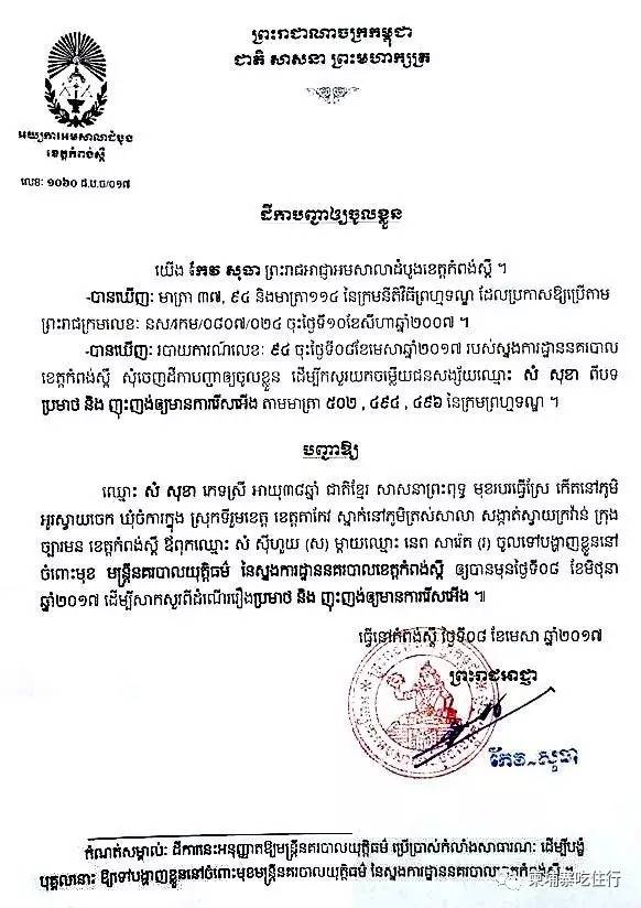 磅士卑消息:2017年6月27日磅士卑初级法院法官向柬媒体透露,已经向曾经用鞋子扔洪森图像的救国党的成员名为宋索卡的女子发出法院传票直接进行逮捕。 此外,磅士卑警方代表称,如果这名女子在磅士卑露面,会立马将她进行逮捕。 法院传票指出,该名女子名为宋索卡,今年38岁。被上诉:于2017年4月1日位于柬埔寨西哈努克省布莱诺县蓝乡乌村对人民党高层国家领导人进行辱骂和污蔑。 而近日,该女子更是举止猖狂,直接录音传播辱骂污蔑人民党高层领导人。 此外,法院传票上还直接下达指令给各个执法机关单位,要求各执法机关务必将该女子送交法庭,以进行依法惩处。 磅士卑警察上将表示,该女子此前在班迭棉芷但是后来一直不见踪迹。如果该女子出现在磅士卑省,不论付出什么样的代价,我们一定会将她进行抓捕,让她接受法律制裁。 此前法院已经发出传召,但是该女子不见踪迹。如今法院直接下达逮捕令对她进行逮捕。法官表示,这次她插翅难飞。 |