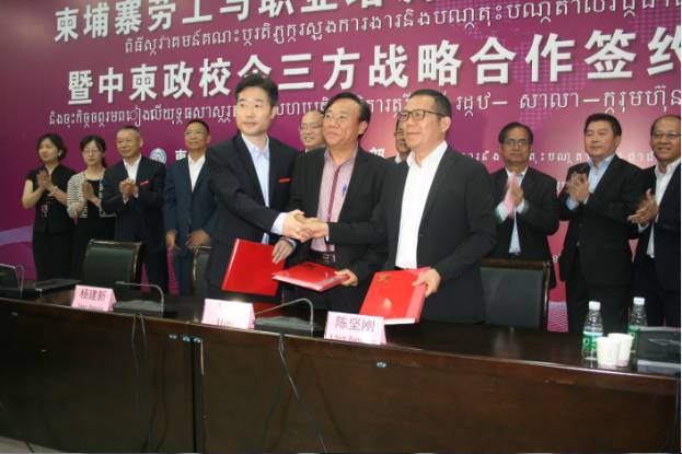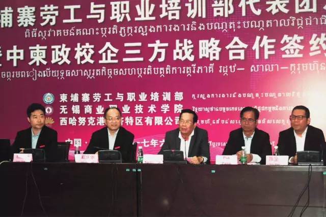 中柬政校企三方签订合作备忘录 6月28日,正在江苏访问的柬埔寨劳工与职业培训部部长毅森兴阁下一行考察无锡商业职业技术学院,参加了中柬政校企三方战略合作签约仪式,柬埔寨劳工与职业培训部职业培训局局长刘兴、无锡商业职业技术学院院长杨建新、西港特区公司董事长陈坚刚代表三方共同签订合作备忘录,明确三方将共同合作,在职业技术培训、学历教育、师资培训、人文交流等多方面开展合作。 自2012年始,西港特区公司就联合无锡商业职业技术学院共同开展培训工作,为区内员工及周边村民提供语言及技能培训,现已开展了11期,累计2.5万人次参加。毅森兴对于校企联合开展培训工作表示肯定。他说,柬埔寨王国政府刚刚颁布了技能培训发展规划,其中提到希望能够成立更多的培训基地,能够为柬埔寨工业发展规划提供专业人才支撑。他希望,通过政校企三方合作,共同打造柬埔寨首个综合技能培训学校,成为中柬双方在技能培训方面的样板。中柬两国是好朋友,真朋友,他相信,随着如今无锡-西港直航的开通,两国、两地的关系会进一步紧密,合作将进一步巩固和深化。 签约仪式上,由西港特区公司与无锡商业职业技术学院共同资助的9位柬埔寨留学生也参加了会议,毅森兴鼓励柬埔寨留学生们努力学习,取得好成绩,以后更好地服务于两国之间的合作。 根据发展规划,中柬政校企三方此番签约,将以学历教育和职业培训为主要任务,培养适应柬埔寨经济、文化和社会发展需要的、掌握国际通用技术技能的应用型人才,为柬埔寨经济社会发展提供可持续人才储备。 |