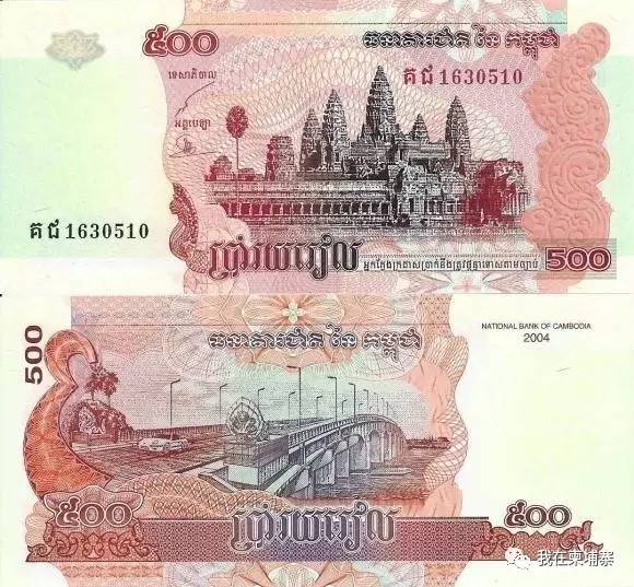 旧版500 瑞尔,正面是吴哥窟,又称吴哥寺,是世界上最大的宗教建筑 ,位于柬埔寨暹粒市北约 5.5 公里处,背面则是磅湛省跨湄公河的地里木桥。
