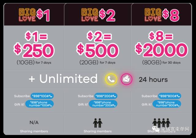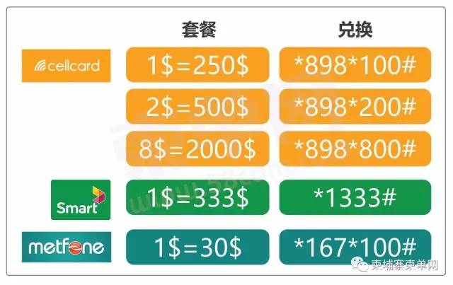 都说柬埔寨物价高上天~ But!有一种东西我敢保证绝对比中国便宜 那就是电!话!套!餐! 有人调侃说,在中国用4G看视频的都是土豪 但在柬埔寨那是毫无压力啊~ 这不,更值得得瑟的事又来了 近日柬各大电话运营商又在打价格战 受益的当然是我们这群吃瓜群众啦 小编不会整那些没用的 三大运营商最新优惠直接打包送上 ▼ 啥?不知道自己是哪家公司的? 小编一张图帮你搞定 理清了自己的门户 小编再给您解读一下这些最新优惠 ▼ Cellcard $1=$250 ,含10GB流量,有效期一星期 $2=$500 ,含20GB流量,有效期一星期 $8=$2000 ,含80GB流量,有效期30天 Smart $1换$333 包含:通话,短信,上网流量, 有效期7天 Metfone $1换$30, 包含:600分钟通话, 1500MB上网流量, 有效期12天 所以现在该怎么做 你懂得 |