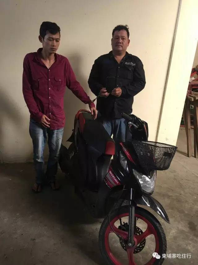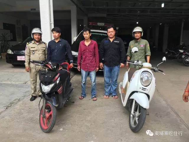 金边消息:2017年7月5日下午两点左右,柬埔寨金边市棉芷区巴萨河分区警方在位于诺罗敦大道处,抓获两名飞车抢劫一名中国同胞手机的犯罪嫌疑人。
