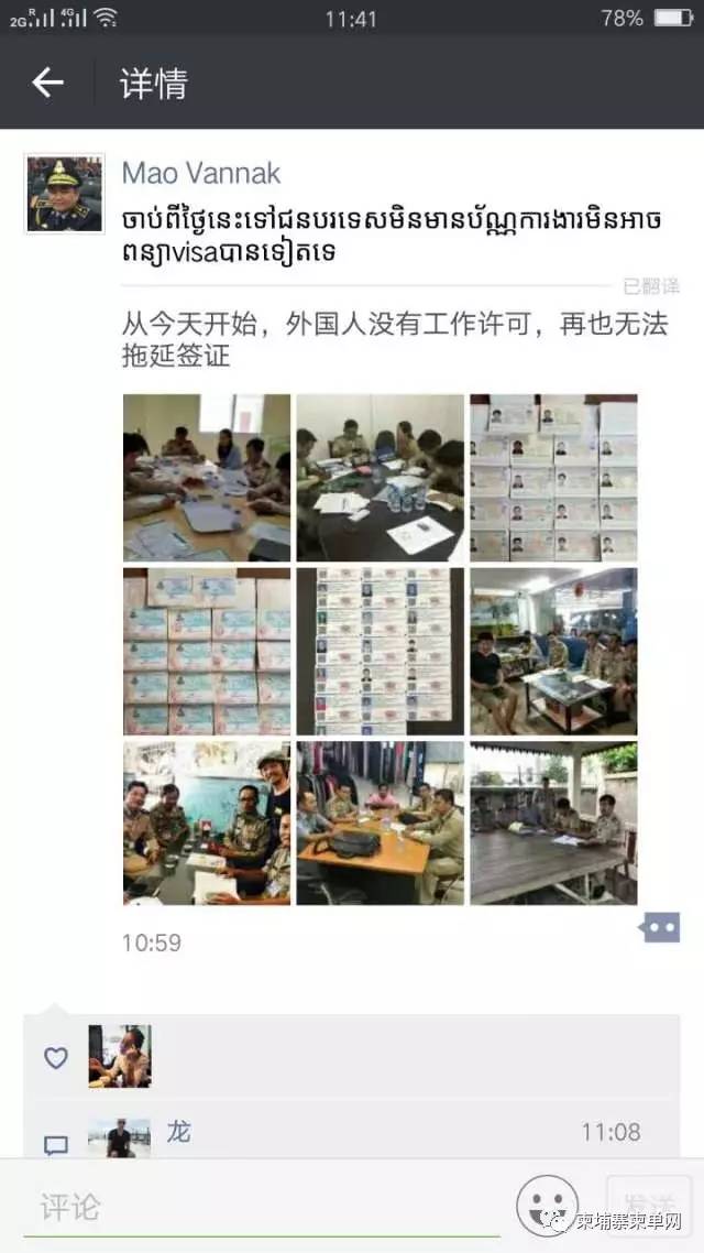 *移民局局长微信截图 上面显示从今日起,没有劳工证的外国人,将不能延期签证。 其中,一名知情人告知小编,关于这个规定,他和几个朋友已经通过一些高官得到证实,基本已经确定下来了,但是具体怎么执行不清楚,正式法规出来还需要时间。 *知情人透露的内容 为了了解到详情,小编也曾多次致电移民局相关人员,但是都无法接通,所以无法得到证实。 但值得注意的是,消息应该不会空穴来风,各位同胞要提高警惕。 另外,柬单网会及时为大家持续跟进报道相关情况。 来自:柬单网 |
