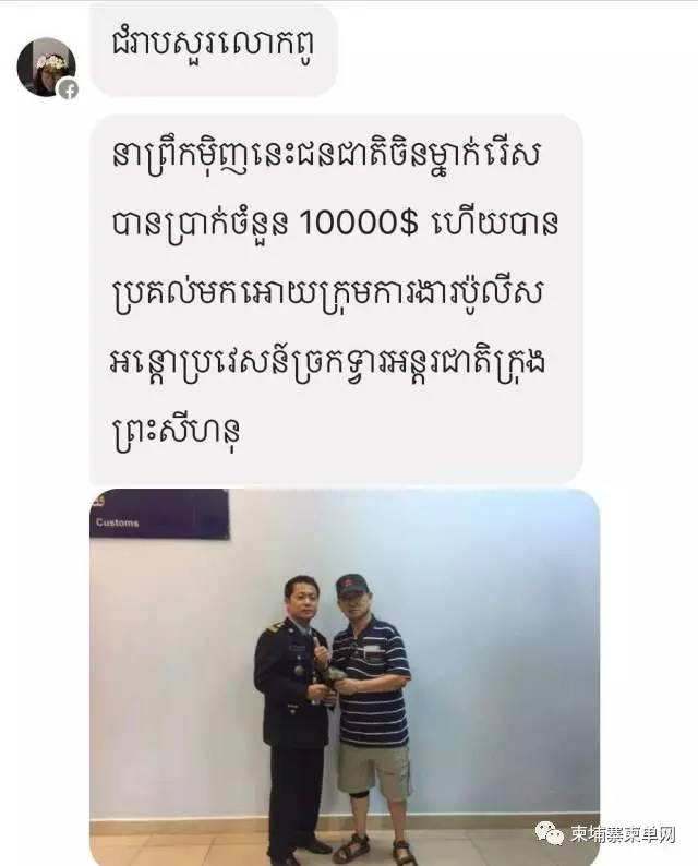 在国外,不少人对中国人有偏见,说话大声、随地吐痰、乱丢垃圾...那就是“中国人”干的...但是近日,有一名中国同胞做了一件好事,让柬埔寨人都竖起大拇指: ——拾金不昧,10000美元如数归还 昨(28)日,有一名柬埔寨人跟柬媒记者Huy Bunleng爆料称,在28日当天上午,西哈努克市,有一名中国男子捡到现金10000美元,好心的他并没有觊觎他人的财物,而是找到当地的边境警察把这些钱交给警察处理。 *爆料聊天记录 10000美元(约合68000人民币)那是等于多少个Gucci包包来着?让小编数数看......真的要给这位同胞竖起大拇指,棒棒哒! *同胞将捡到的现金交给警察 如此正能量,应该传播给更多的人知道! 另外,警方在收到现金之后,也马不停蹄的找到了失主,并如数归还。 *警察将钱归还失主 希望我们身边多一些这样的人,或许这个世界会变得更美好一点。来自:柬单网 |