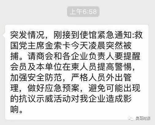 救国党主席金索卡今天凌晨突然被捕。请商会和各企业负责人要提醒会员及本单位在柬人员提高警惕,加强安全防范,严格人员外出管理,做好应急预案,避免可能出现的抗议示威活动对我企业造成影响。来自:吴哥时报