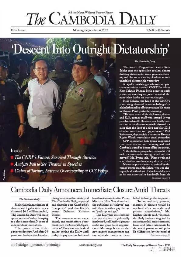 一名读者正在阅读今天的最后一期《柬埔寨日报》 今日《柬埔寨日报》头版,标题为:深陷独裁专政 (本报讯)《柬埔寨日报》因拖欠政府超过650万美元税务,从今(4)日起停止出版。 昨(3)日,洪森出席与工人见面会时表示,《柬埔寨日报》欠税总值超过650万美元,如果不能缴纳应缴的税款,就请离开柬埔寨吧。 《柬埔寨日报》创立于2003年,至今已运营了24年零15天。 昔日繁忙的报社,如今已人去楼空。 财经部税务局负责人表示,该局给《柬埔寨日报》缴纳欠税期限至今(4)日为止。即使《柬埔寨日报》停刊,该交的税还是要追缴,将继续追究相关人员责任,此外报社负责人不能随便离境。 税务局称将继续追缴所欠税款 但《柬埔寨日报》负责人则表示,完全是因为政治动机而被迫关闭,很自豪这些年“勇敢、自由地报道真相和事实”。 来自:吴哥时报 |