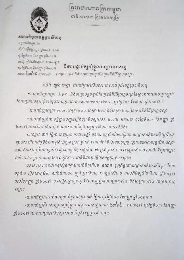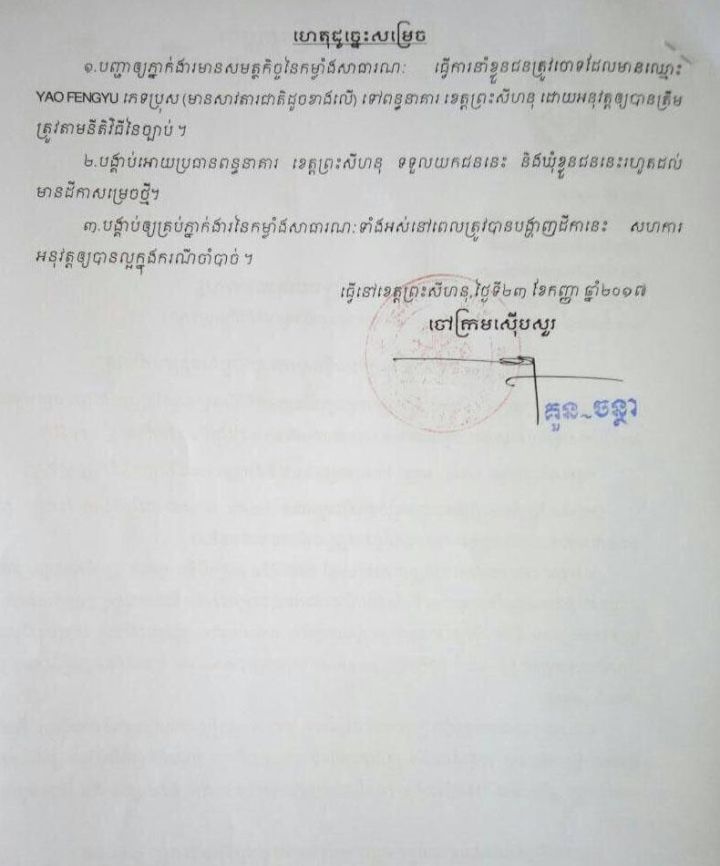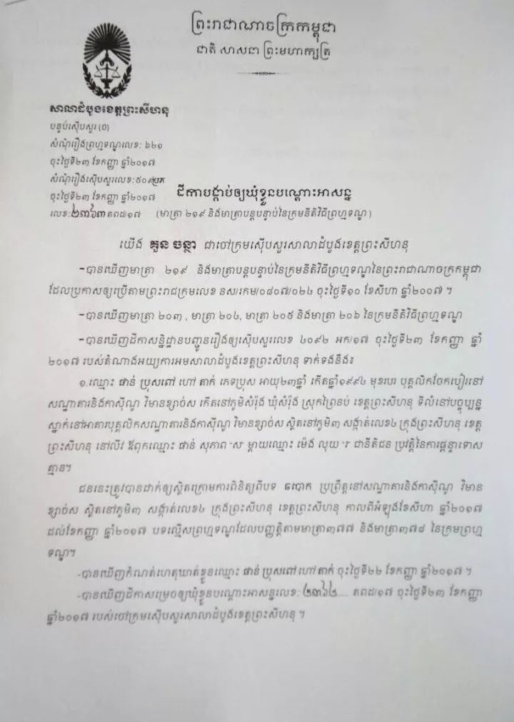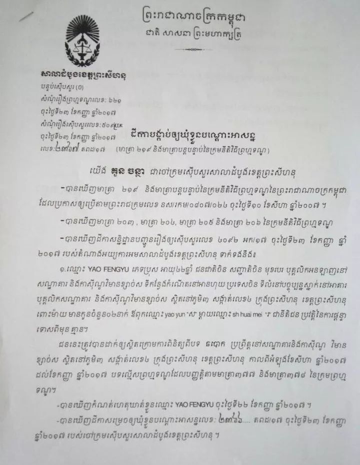 昨(23)日,西港一赌场内三名员工涉嫌诈骗被拘捕,其中一名为中国籍。 据西港初级法院检察官冠占塔(Kun Chantha)称,22日西港白沙纪念酒店赌场老板指控其赌场员工42岁的中国籍姚某、柬埔寨籍19岁的酿维其卡(Nhiank Vichika)和23岁的潘波罗堡(Phan Brosbou),三人在赌场内帮客人出老千赢钱,之后与客人将所赢的钱分赃。 警方接到报案后将三人拘捕,经初步调查后,昨(23)日西港初级法院根据刑事诉讼法第277条和278条规定,以涉嫌诈骗罪正式批捕该三名男子,立案调查。 目前,这三名男子已被西港警方带回警局待进一步审问调查。 西港法院发布正式批捕立案文书 来自:吴哥时报 |