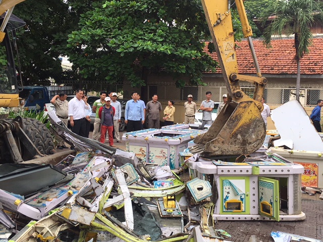 金边市堆谷区展开销毁角子机行动,捣毁22部角子机。 这项行动是於前天上午进行,堆谷区长、副区长和相关官员见证销毁过程。 堆谷区长艾坤登指出,非法游戏中心造成罪案频发,是棘手的问题,所以当局持续採取行动。 22部角子机是当局在这两个月以前陆续的起获的。(柬埔寨星洲日报)
