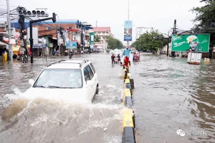 持续暴雨,首都金边及全国部分省市水淹严重。 金边城区 昨日下午桔井省一辆小车被洪水冲走,幸无人伤亡
