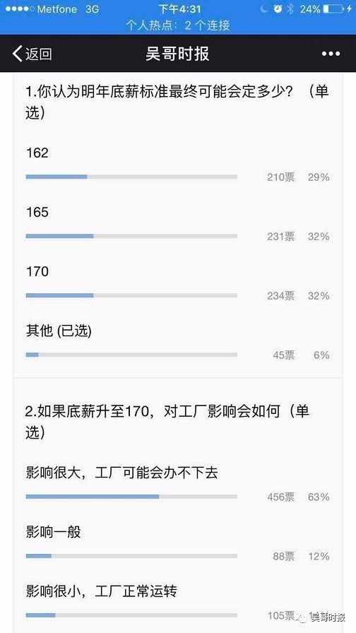 商会、工会和劳工部三方最终投票 今(5)日下午,商会、工会和劳工部三方最终投票决定明年底薪标准,为165美元。 三方提出的三个底薪标准分别是:162美元(商会)、170美元(工会)、165美元(劳工部),最后投票结果为劳工部提出的165美元。按照惯例,将此标准提交给洪森后,洪森还会在此基础上再加5美元,最后底薪或将定为170美元。 今年的底薪标准是153美元,这样的话,明年的底薪标准比今年将提高17美元。 昨(4)日,本报推出关于底薪的调查,共有722名读者参与投票,其中32%预测底薪将定为170美元,63%认为这样的底薪标准对工厂影响很大,工厂有可能会开不下去。 民意调查截图 来自:吴哥时报 |