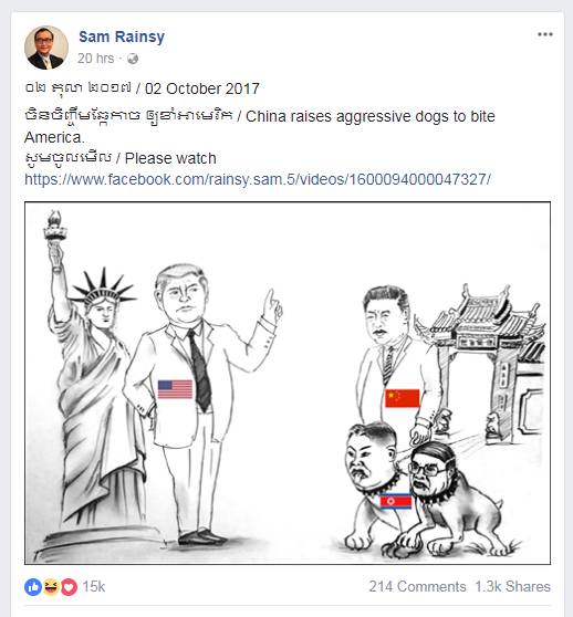 昨(10月3日)晚,沈良西在脸书(Facebook)上发布了一条状态,包含了一段文字,一个视频链接,以及一张图片。状态中写到“China raises aggressive dogs to bite America”——中国饲养好斗的狗来咬美国。 >>>事件<<< 发布的图片中:左边是美国,右边是中国牵着朝鲜的金三胖,还有旁边一个人。虽然没画国旗,但沈良西发的还能有谁,只能是现任柬埔寨总理洪森……(视频的内容与图片描述的意思一样) 发布的20小时内,该条状态收获了200多条评论,小编扒了一下网友言论: Uy Pheara:“这张图是有意义的,它能使柬埔寨人对此有更深的理解。” Chantal Chea:“恨美国但爱美金,哈哈。” Phoum Uchiha:“这张图不可能是真的。” Khuoch Sive:“这张图说的对,当一方需要食物来生存时,另一方就能得到他想要的一切。” >>>相关话题<<< 自救国党主席因涉嫌“勾结美国,意图叛国”遭到逮捕以来,美国和柬埔寨的外交关系几乎跌至冰点。洪森频频发言:美国我不怕你!并驱逐美国政府资助的人权组织、关停美国人所办的英文媒体《柬埔寨日报》…… 另一边美国驻柬埔寨大使馆更发布公告,让在柬美国公民注意安全。 面对这一现象有不少境外媒体发表言论称:“柬埔寨不仅在经济上越来越依赖中国,现任柬埔寨总理兼柬人民党主席、政治强人洪森在意识形态领域的管控也越来越趋于‘中国化‘”。 柬人民党发言人则表示:“柬埔寨外交政策绝不针对任何国家。接受援助并不等于听从他们发号施令,我们不是他们的盟友,我们不是他们的奴隶。中国人总是支持我们的经济增长,从未干涉我们的决定。” 洪森也一再强调:“中国是柬埔寨最坚强的后盾,无论在何种情况下,中国都将继续向柬埔寨提供帮助,没有哪一个国家可以破坏柬中两国关系。” 而中国方面,9月19日至21日,中共中央政治局常委、中央书记处书记刘云山对柬埔寨进行正式访问,刘云山表示:中国共产党和柬埔寨人民党的关系对两国关系发展发挥着重要引领作用,两党应继续密切高层接触,深化治党治国经验交流,加强各领域之间友好合作,推动两党关系发展到一个新水平。刘云山感谢柬方给予中方的宝贵支持,表示中方将继续为柬埔寨的稳定、发展、繁荣提供力所能及的帮助。 来自:柬单网 |