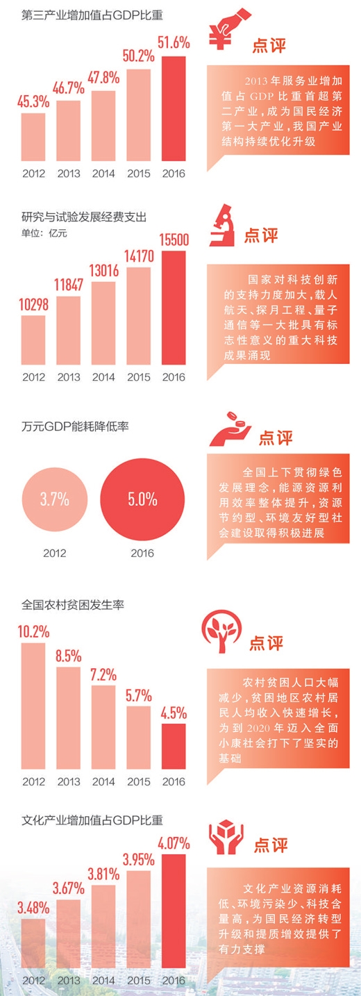 图为上海市四通八达的高架桥。 人民视觉 回看十八大以来的发展曲线,有起有伏,有陡峭有平缓,汇聚成了一份可圈可点的答卷。 先看平稳的曲线。2013—2016年,国内生产总值年均增长7.2%,中国经济保持中高速增长。就业、物价也走得稳稳的。2013—2016年,城镇新增就业连续四年保持在1300万人以上,31个大城市城镇调查失业率基本稳定在5%左右。2013—2016年居民消费价格年均上涨2%。这三条曲线构成经济发展基本盘,绘制出难能可贵的平稳底色。 再看上扬的曲线。2013—2016年,服务业增加值年均增长8%,比国内生产总值增速高0.8个百分点;2013—2016年,装备制造业和高技术产业增加值年均分别实际增长9.4%和11.3%,快于规模以上工业1.9和3.8个百分点;2016年,研究与试验发展(R&D)经费支出15500亿元,比2012年增长50.5%。这三条曲线的上扬折射出经济结构优化升级、创新能力快速增强,中国经济迈向中高端。 最后看下行的曲线。2016年农村贫困人口4335万人,比2012年减少5564万人,平均每年减贫近1400万人;2016年,单位国内生产总值能耗、用水量分别比2012年下降17.9%和25.4%,主要污染物减排效果显著;2013年以来,国务院陆续取消和下放618项行政审批等事项,提前完成本届政府减少行政审批事项1/3的目标。这三条曲线的“减量”带来了老百姓获得感的“增量”,经济社会发展与生活幸福感同步前行。 在新发展理念的引领下,中国的发展正破解难题、增强动力、厚植优势,努力走上更高质量、更有效率、更加公平、更可持续的光辉大道! 保障房 儿子得病去得早,儿媳在外打工养家。以前我和老头带着两个孙子,挤在30平方米的瓦房里,屋子又暗又潮,孙子们经常搬凳子蹲到外面写作业,我当奶奶的心疼啊!去年,我申请了廉租房,50多平方米的两居室,每个月房租加物业费只交100多元,屋子亮堂住得也舒服。日子稳定了,大孙子也争气,今年中考考了600多分,我有盼头哩! ——江西省宜春市袁州区低保户杨会清 大病保险 去年8月,我被确诊为急性坏死性胰腺炎。此后4个月时间内,我先后在厦门、福州及南京多家医院住院治疗,共花了100多万元医疗费,花光了家里所有的积蓄不说,还负债10多万元,我和家人感觉天都要塌了。绝望之下我向保险公司提交赔偿申请,不到6天,就收到了大病保险赔付金30多万元,及时还了债务,一大家子没有陷入困境。谢谢国家政策! ——福建省厦门市丁明 创 业 以前,我们家和县里100多户民宿经营户迟迟拿不到旅馆业特种行业许可证。去年天台县将民宿许可制改为备案制,出台了《民宿登记管理暂行办法》,经营户都可以去办民宿证照了。我家不到5天就拿到了营业执照,成了阳光下的合法民宿,能给游客开住宿发票,生意也好了,现在干个体真比过去容易了。 ——浙江省天台县民宿经营户陈卫明 共享经济 以前出了地铁站,步行到单位还得走路半个多小时。现在出站后只需打开手机,扫一扫共享单车二维码,蹬着轮子一会儿就到办公室了,上班路程变得轻松了很多。此外,房屋短租供需双赢,网约车省时省心,共享充电宝使手机不再有断电关机之虞,共享课程使付费知识获取更划算,共享旅馆让外出旅游更实惠……共享经济给人们生活带来的获得感无处不在。 ——北京IT从业者陈瑢 养老金 2012年,我的退休金不到2000元。退休金年年涨,现在每个月有将近2500元。一有养老金的新闻我都特别关注,几乎都是好消息。最令人开心的是,每次新闻里说养老金要提高多少,我都记着,并算算能涨多少,这5年来,政府每次都说到做到!有时候还有惊喜,实际增长的部分比我自己算的还要高呢。 ——福建省泉州市纺织厂退休女工鲁华彩 (本报记者丁怡婷、申少铁、林丽鹂、齐志明、李心萍整理) ![]() |