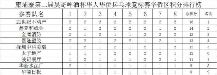 昨(8)日,第二届“吴哥啤酒杯”华人华侨乒乓球锦标赛华侨区比赛结束,21世纪不动产队获华侨区冠军。 昨日,在接近尾声的一场循环赛中,21世纪不动产队与鑫亚和纸业对决。从综合比分来看,这场比赛对两个队伍都是关键的一战,将决定华侨区冠军的归属。原本21世纪不动产队胜券在握,没想到比赛刚开始,每战皆捷的主力一号发挥失常,意外丢了2场。在双方关键的三号单打对决中,第2局鑫亚和纸业队以10:5获取赛点,21世纪不动产队三号选手临危不乱,硬是一分一分将比分追成10:10平,最后反以12比10拿下这关键的一局。最终21世纪不动产队以大比分3:2险胜鑫亚和纸业队。 经过8场循环赛,21世纪不动产队以8场全胜总积分16分的战绩获得华侨区冠军。鑫亚和纸业队以总积分14分的成绩获得亚军,金鹰消防队总积分13分获得季军。 比赛过后,获胜队伍到新老地方聚餐庆祝。 据技术总指挥李晓菲称, 22日将进行本届比赛的总冠军争夺赛,届时华侨区冠军21世纪不动产队将和华人区冠军太子地产队争夺总冠军。 据悉,华人区冠军队是以柬埔寨国家乒乓球青年队3名教练及国家队最优秀的球员组成,实力非凡。21世纪不动产队的选手孔汉涛称,比赛时靠临场发挥,狭路相逢勇者胜。更何况经过这段时间的几场比赛,我们的队员们更是越战越勇,越战越有信心。 华人区冠军太子地产队李金星是柬埔寨乒乓球国家青年队教练,他称,上一届“吴哥啤酒杯”乒乓球赛他也是华人区冠军队的选手,“吴哥杯”比赛很热闹,无论输赢,比赛结束后所有选手都会一起聚餐,相互交流,很开心。“上一届没能获得总冠军,这次争取拿下!”李教练说道。 据悉,总冠军争夺赛时,21世纪不动产队邀请了来自中国的专业球员外援来参赛。对此,华人区冠军队表示欢迎,“很难得能有机会跟中国的专业球员切磋球技,希望通过这次比赛能增加球员的比赛经验,提高球技。” 李晓菲透露,本次外援球员,都是有专业背景的乒乓球俱乐部的高手,其中有一位是中国国家青年队退役球员。相信到时候的比赛一定会非常的精彩。 想要一睹国家级专业乒乓球运动员过招, 10月22日上午9:00在金边奥林匹克运动场,欢迎到场观赛。 来自:吴哥时报 |
