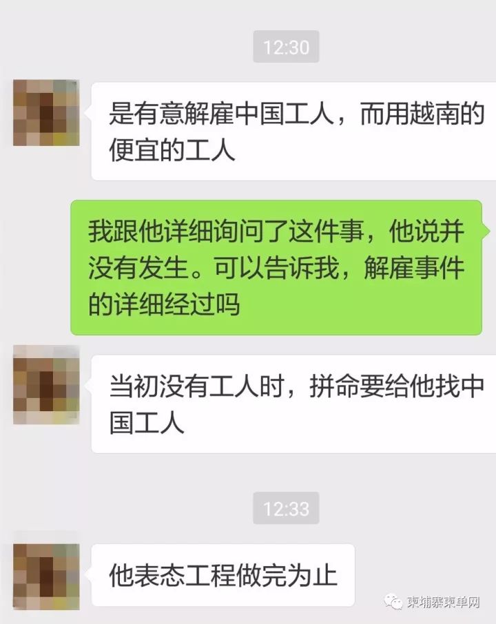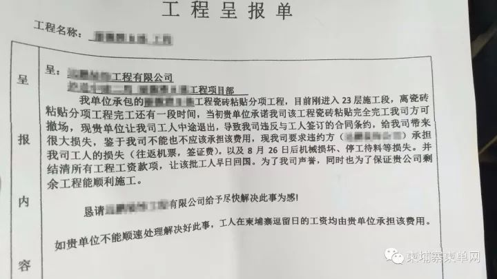 前(28)日,金边钻石岛某公寓遭多名中国籍与柬籍工人示威抗议。昨日我们联系采访到承建方郭总,郭总向我们解释了事情的来龙去脉:钻石岛中柬工人集体示威,承建方有话说!但仅是郭总的一面之词。经过小编的多方了解后,今日上午,我们终于联系到此次讨薪的工人代表邹先生以及董先生。 > >>>事件<<< 前(28)日,多名中国籍以及柬籍工人在钻石岛某公寓前示威抗议。柬媒表示该公寓施工时因雇用工资较便宜的越南籍工人后,便解雇中国籍以及柬籍工人,即使中国籍以及柬籍工人已完工后,仍拖欠中国籍工人约8万美金工资、柬籍约3万美金工资。 昨日小编采访到了承建方的郭总,郭总表示,并未发生任何解雇事件。但今天小编对工人代表董先生以及邹先生进行采访后,听到了完全不同的说法。他们表示,希望还中国工人一个清白。 >>>跟进采访<<< 邹先生表示: 早些时候,该工程的地面砖墙面砖都还没有装,来了几个班组没效率、质量也不好。于是承建方郭总就找到我,希望从国内调一批中国工人来接手这个项目。并且承诺,保证工人们做到项目完成为止。于是我为郭总从国内调来了30个中国工人。由于相信郭总的承诺,并没有签订任何的合约。9月份的时候,我们班组一共做了6层的项目,郭总忽然找到我,告知我们不用继续做了,因为业主表示用越南工人更便宜,做了也拿不到钱。但当我与业主进行对峙时,业主表示,自己从来没有说过这样的话。 于是,在10月2日,邹先生向郭总的公司递交了一份工程呈报单: 工程呈报单里表示由于郭总的违约,所以需要承担工人的损失,包括往返机票和签证费用。 邹先生说,因为该项工程要到做完为止,所以并没有给工人安排其他的工作,由于郭总的临时解约,工人们在接下来的时间里没有办法工作赚钱,工人要求回家,所以他才要求郭总承担机票和签证的损失,并且并没有向郭总索要违约的费用。 10月17日,郭总曾付给该班组2万4千5百美金,作为整个工程款的一半,但剩下的钱始终没有谈妥。 邹先生说,“最大的遗憾就是我们当时太信任郭总了,所以没有签合同。我们是受害者,业主也是受害者。最可怜的还是这些中国工人们。” 截止到发稿为止,该事件仍在商讨和解决之中。小编想说,我们出门在外都不容易,同胞之间更应该多一份诚信和体谅。希望此次事件,能有一个能让多方都满意的结果,希望工人们早日拿到自己的血汗钱,早日回家。 来自:柬单网 |