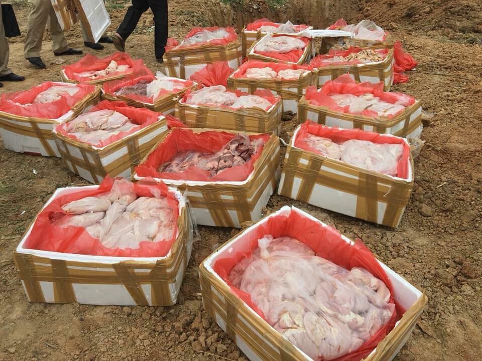 打击经济犯罪办事处警方拦截两辆汽车,查获从泰国非法进口的1890公斤鸡肉和猪脚,之后于昨天下午,在金边市朗哥分区的垃圾场放火销毁这些肉品。
