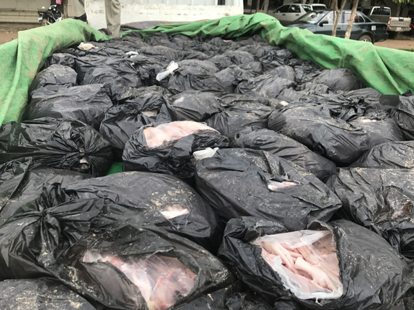 昨日中午12时30分在卜迭棉芷省是士分市,该省打击经济犯罪办事处警方拦截两辆汽车,查获从泰国非法进口的850公斤劣质鸡肉和鸡脚。