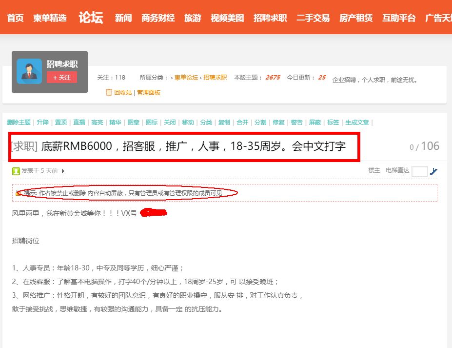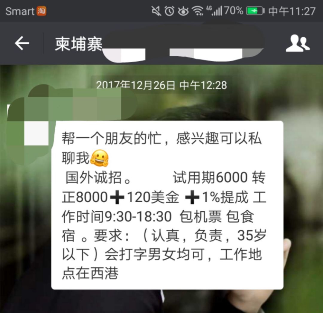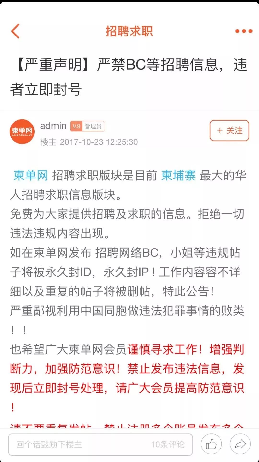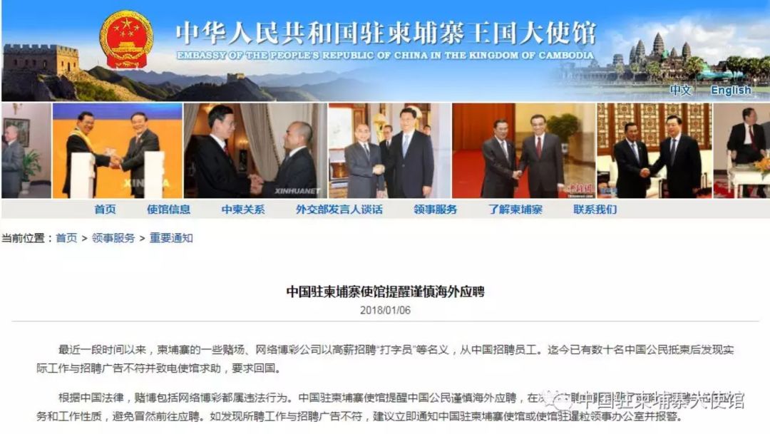 不知道大家看到这个招聘信息的第一反应如何? 工资很高我要去试试? 那恭喜你,被骗了 现在大量的赌博和博彩公司 在网上发布相关高薪招聘信息 借着“打字员”的外皮 欺骗了无数中国同胞 昨日中国驻柬埔寨大使馆发布一项重要通知 提醒同胞谨慎海外招聘 最近一段时间以来,柬埔寨的一些赌场、网络博彩公司以高薪招聘“打字员”等名义,从中国招聘员工。迄今已有数十名中国公民抵柬后发现实际工作与招聘广告不符并致电使馆求助,要求回国。 根据中国法律,赌博包括网络博彩都属违法行为。中国驻柬埔寨使馆提醒中国公民谨慎海外应聘,在决定应聘前要详细了解确认招聘单位的业务和工作性质,避免冒然前往应聘。如发现所聘工作与招聘广告不符,建议立即通知中国驻柬埔寨使馆或使馆驻暹粒领事办公室并报警。 前几日我们还曾报道过 就是因为实际工作与招聘广告不符 来柬一周都没有工作可做 而博彩和赌博诈骗招聘信息遍布各大社交网站 打着高薪的幌子 而工作实际情况却不知相差多少 豆瓣: 贴吧: (菠菜即博彩) 我们柬单网APP招聘板块上 每天也有大量的博彩公司招聘贴 对此,我们柬单网只想说 封号!删除! 严禁鄙视利用中国同胞做违法犯罪的败类! 每天工作人员要删除上百篇博彩的招聘信息 封号几十个 我们在尽可能担负起 作为柬埔寨最大中文网站的责任 努力减少中国同胞被骗的几率 也希望广大同胞擦亮眼睛 提高防范意识,谨防被骗! >>>相关话题<<<