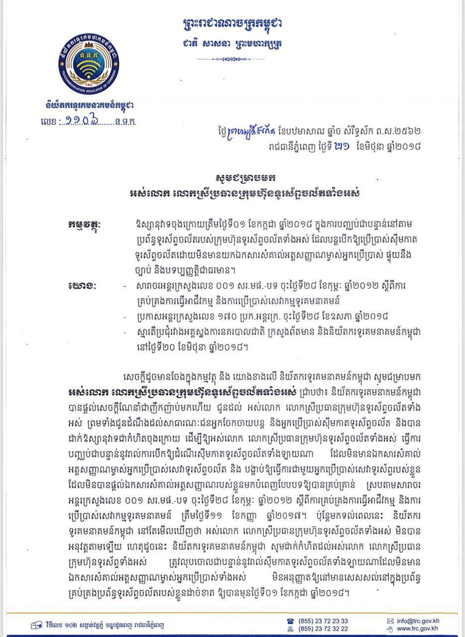 柬埔寨电信管理局警告所有的移动电话公司必须在今年7月1日为止,删除所有无登记用户身份证或者其它证件的电话卡(Sim Card)。 柬埔寨电信管理局采取以上的举措是因为当局发现迄今为止,仍然有一些移动电话公司还是继续销售无登记用户身份证或其它证件的电话卡,这些违犯了柬埔寨有关法律的规定。 据 Fresh News 于2018年6月22日接到柬埔寨电信管理局的通告得知:“柬埔寨电信管理局规定所有的移动电话公司总裁和负责人要在2018年7月1日之前删除自己公司所有没有登记用户身份证或相关证件的电话卡。” 柬埔寨电信管理局也说明了邮电部的工作组和国家警察总署将展开检查,若发现某个移动电话公司仍然继续允许没有登记用户身份证和有关证件的电话卡,该公司必须将面对法律的责任,绝不会被宽恕。 详细的信息,请阅读柬埔寨电信管理局的通告全文: |