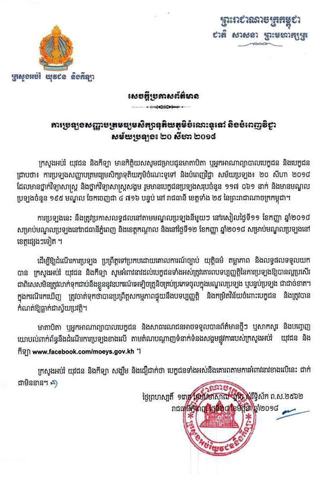 (金边讯)教育、青年和体育部指出,2018年高考有11万7061人和考场有195个,分成4716个课室。这是 Fresh News 2018年6月28日上午获得教育部的通告。 教育部指出,2018年考试成绩将在2018年9月11日下午发布,这是针对金边和干拉省,在2018年9月12日将发布其他各省的成绩。 值得一提的是,今年高中考试在2018年8月20日举行,分成科学和社会科学考试。 请阅读下面的新闻通告详细内容: |