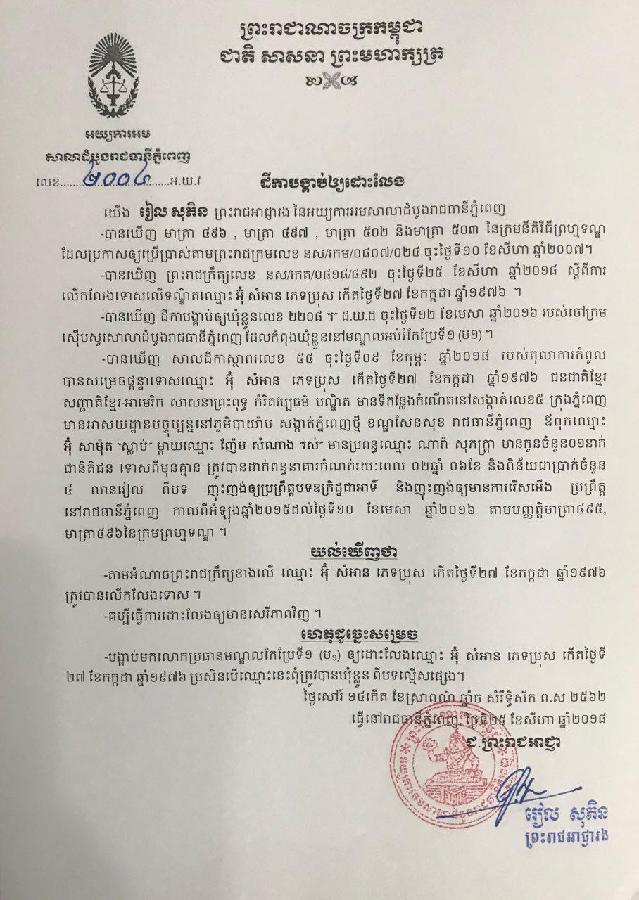 前救国党议员翁颂安获得柬埔寨国王诺罗顿.西哈莫尼陛下在2018年8月25日批准特赦,在柬埔寨王国政府总理洪森亲王的要求下。这是 Fresh News 2018年8月25日获得王令。 王令:第1条:特赦囚犯翁颂安,男,40岁被法院在煽动犯罪(影响社会安全)和高级法院在2018年2月9日宣布的煽动歧视罪。 法院的指令指出:“在王令权利下,翁颂安,生于1976年7月27日批准特赦”应该获得释放。 在得到柬埔寨国王陛下的王令,金边法院也发出指令给监狱局局长,在今天下午释放前救国党议员翁颂安。 应提的是,翁宋安在2016年4月10日晚上在暹粒省被逮捕,在他从美国返回柬埔寨后。 翁颂安被法院在2018年2月9日决定判处2年6个月和罚款400万瑞尔,在两个罪名下,就是《煽动犯罪》(影响社会安全)和《煽动歧视》根据刑事法第495条和496条的。他是在2015年到2016年4月10日在金边犯罪,通过编写和发表指控王国政府关于柬埔寨越南边境地图公约。他被法院决定关押在白梳监狱。 来自:fresh news |