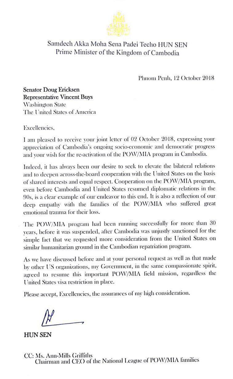 柬埔寨王国政府总理洪森亲王通过信件宣布,柬埔寨王国政府同意恢复寻找在柬埔寨的美国军人骸骨。这是 Fresh News 2018年10月12日收到洪森亲王发给和回应美国华盛顿参议员 Doug Ericksen 和议员 Vicent Buys 。 在信件中,洪森亲王指出:“就像我们上次讨论和回应阁下的要求和其他美国相关组织的要求,我的政府就像在以前的慈悲精神同意恢复重要的 POW/MIA 寻找骸骨合作,无论是美国还在签证制裁。” 洪森亲王指出,我们经常有意愿提高双边关系和深化合作,站在共同利益和尊重。 POW/MIA 项目在柬埔寨和美国在1990年恢复建交之前是我们努力的例子,为了这个目标,也反映对被俘和失踪军人家属的深切感情。 应提的是,寻找在柬埔寨的美国军人骸骨在2017年9月由柬埔寨王国政府总理洪森亲王宣布暂停,在美国暂停给柬埔寨外交部官员从局长到高级官员发放B1和B2签证(旅游和商业类型)。 柬埔寨-美国外交更加紧张。同时,美国也继续加强签证限制柬埔寨官员,被他们认为影响柬埔寨民主。直到现在,寻找在柬埔寨美国军人骸骨暂停一年,正当在柬埔寨失踪的美国军人有80人,现在找到40人骸骨。 来自:fresh news |