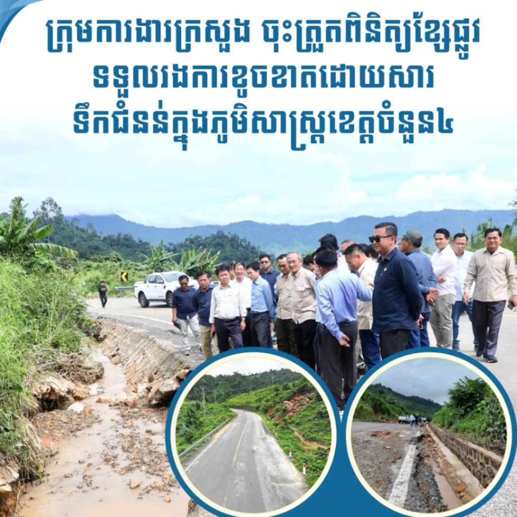 【柬埔寨头条综合报道】据柬媒消息,10月2日,柬埔寨公共工程与运输部国务秘书老万与国务秘书任文那率领工作组,前往磅清扬省、菩萨省、马德望省以及卜迭棉芷省,视察因近期洪水受损的道路状况及相关修复项目的进展。 此次视察旨在全面了解洪涝灾害对交通基础设施造成的影响,评估受损路段的安全状况,确保民众出行安全,并督导灾后修复工程的实施进度。 据悉,因连日强降雨,部分地区道路严重受损。其中,55号公路于2025年9月29日因连续七天强降雨导致道路积水,并引发山体滑坡,造成交通中断。 |