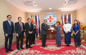 这笔善款由郭索帕副首相亲自交给柬埔寨红十字会秘书长布占提妮。这笔资金将专门用于帮助柬埔寨受洪灾影响的民众。(编译:影子) |