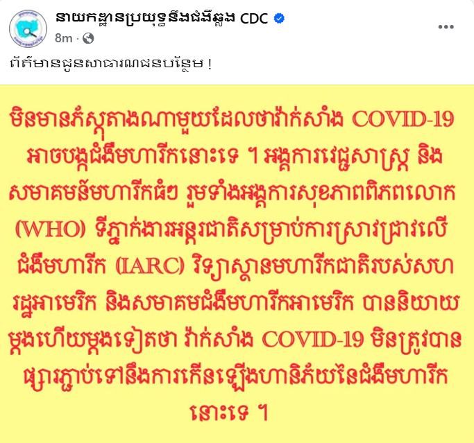 【柬埔寨头条综合报道】据柬媒10月4日报道,柬埔寨疾病预防控制中心(CDC)于当天下午发布声明,明确指出目前没有任何科学证据表明新冠疫苗会导致癌症。 声明强调,包括世界卫生组织(WHO)、国际癌症研究机构(IARC)、美国国家癌症研究所(NCI)及美国癌症协会(ACS)在内的多家国际权威机构,均已多次表示:新冠疫苗不会增加患癌风险,与癌症之间不存在关联。 因此,请公众不要轻信或传播有关疫苗致癌的错误信息。 |